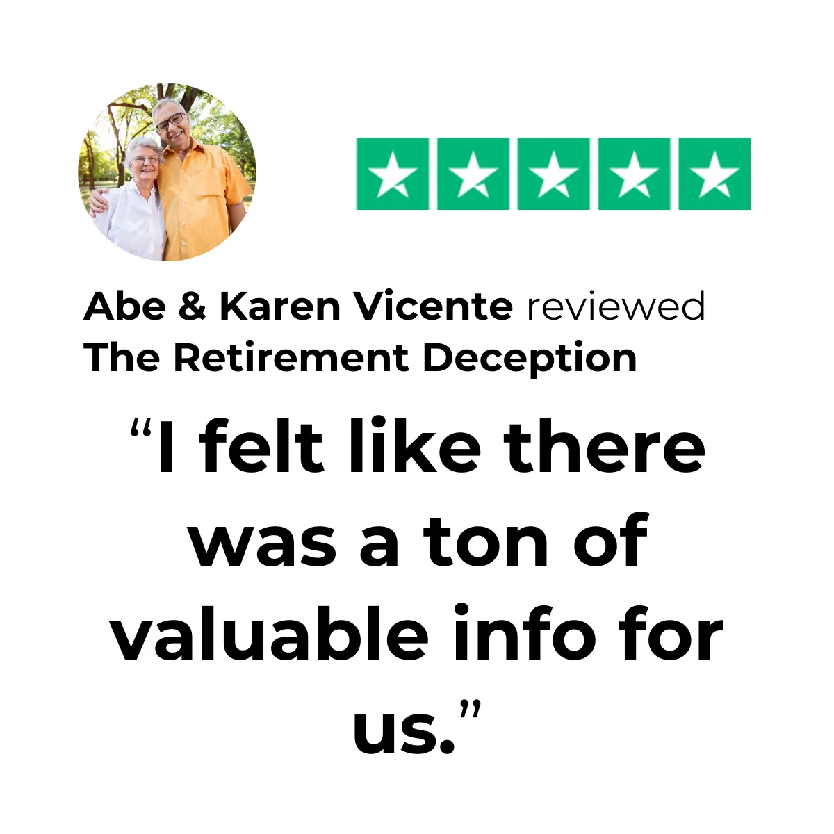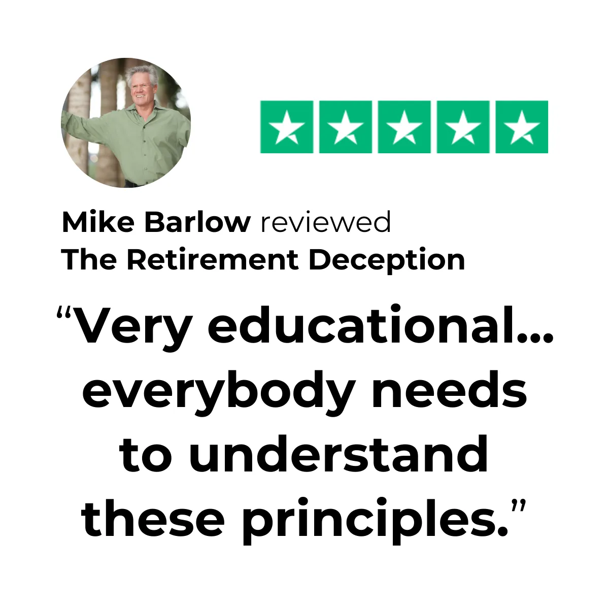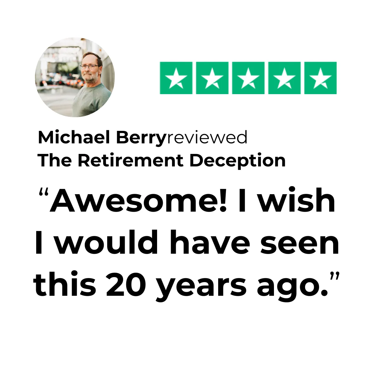 It shares the lessons learned from real people who have already retired successfully and how they did it. The producers of the film traveled over 20,000 miles, over 26 cities across the country to interview people who share what a successful retirement really is, and expose common myths and misconceptions that Wall Street has perpetrated on the public.
